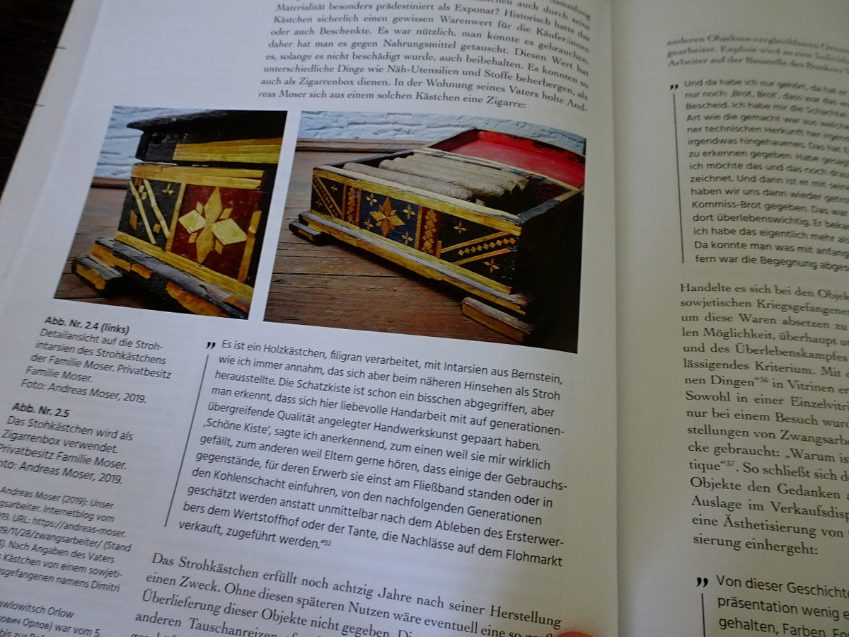 Insbesondere der Förderverein Gedenkstätte Stalag 326 (VI K) Senne e.V. hat etliche derartige Objekte und viel Wissen zusammengetragen. Eben ist Band 5 der Schriftenreihe des Vereins erschienen: „Verflochtene Geschichten: Kunsthandwerkliche Arbeiten sowjetischer Kriegsgefangener in Sammlungen, Ausstellungen und Vermittlung“
